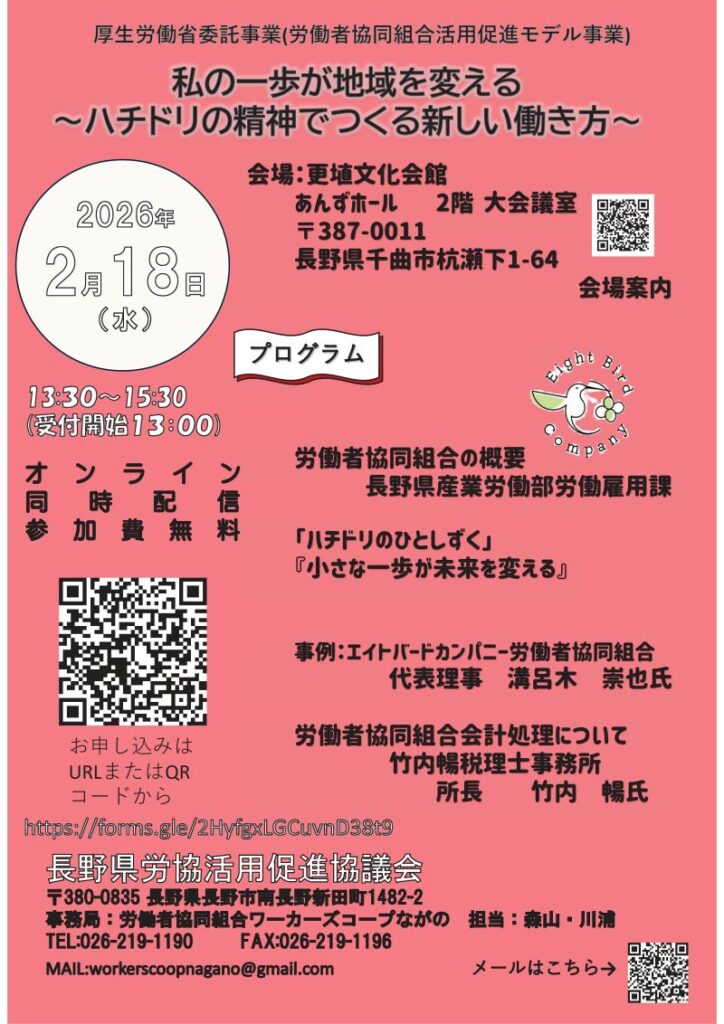 【2月18日(水)開催】【千曲市】「私の一歩が地域を変える ~ハチドリの精神でつくる新しい働き方~」セミナー開催のお知らせ 2026年1月14日 最終更新日時 : 2026年1月14日 editor 2月18日(水)に千曲市にて「私の一歩が地域を変える ~ハチドリの精神でつくる新しい働き方~」セミナーを開催します。詳細は下記チラシをご確認ください。ご参加お待ちしています!お申し込みはこちらからチラシのPDFはこちら