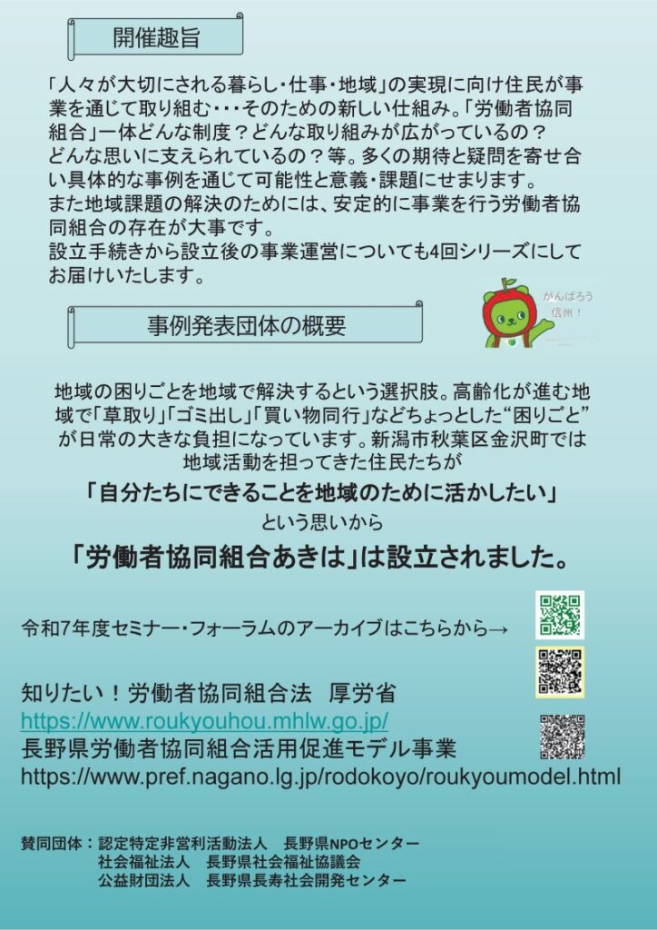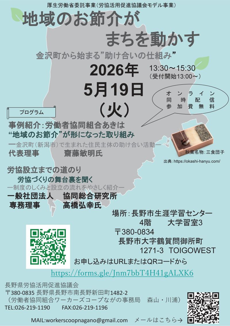 【5月19日(火)長野市】「持続可能な労働者協同組合設立のためのセミナー」開催のお知らせ 2026年4月24日 最終更新日時 : 2026年4月24日 editor 5月19日(火)に長野市にて「持続可能な労働者協同組合設立のためのセミナー」を開催します。詳細は下記チラシをご確認ください。ご参加お待ちしています!お申し込みはこちらからチラシのPDFはこちら